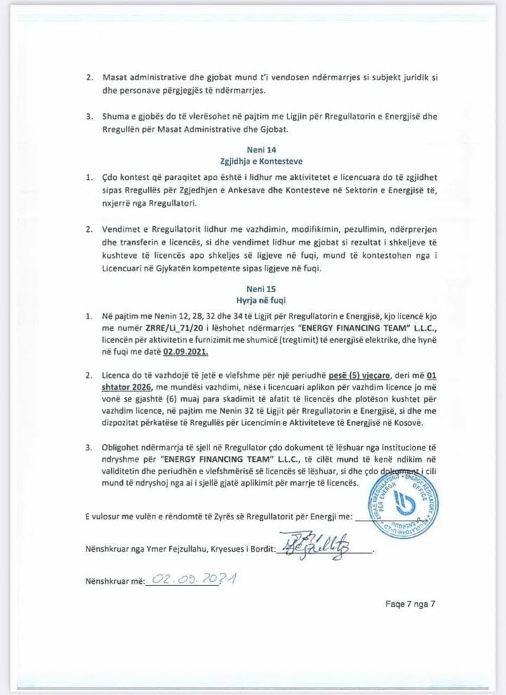 Vetëvendosje në vazhdimësi ka mohuar të është licencuar EFT’ja përgjatë kohës së pushtetit të këtij subjekti politik. Megjithatë, në bazë të këtij dokumenti, shihet se nënshkrimi i dhënë nga Ymer Fejzullahu i ZRRE’së është i datës 2 shtator 2021.