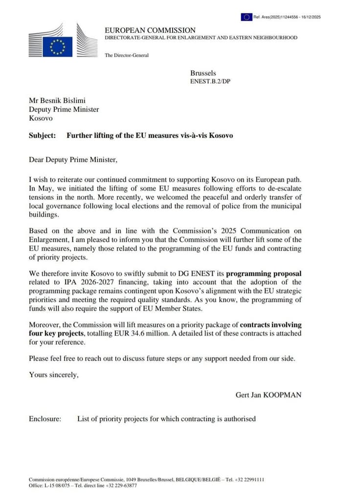 Besnik Bislimi: Gjatë ditës së sotme kam pranuar një letër nga Drejtori i Përgjithshëm për Zgjerim të Bashkimit Evropian, Gert Jan Koopman, ku komunikohet se Komisioni ka vendosur për heqjen e shumicës së masave ndaj Kosovës. Bëhet fjalë për projekte të lidhura me programet IPA, në vlerë prej 34.6 milionë euro.
