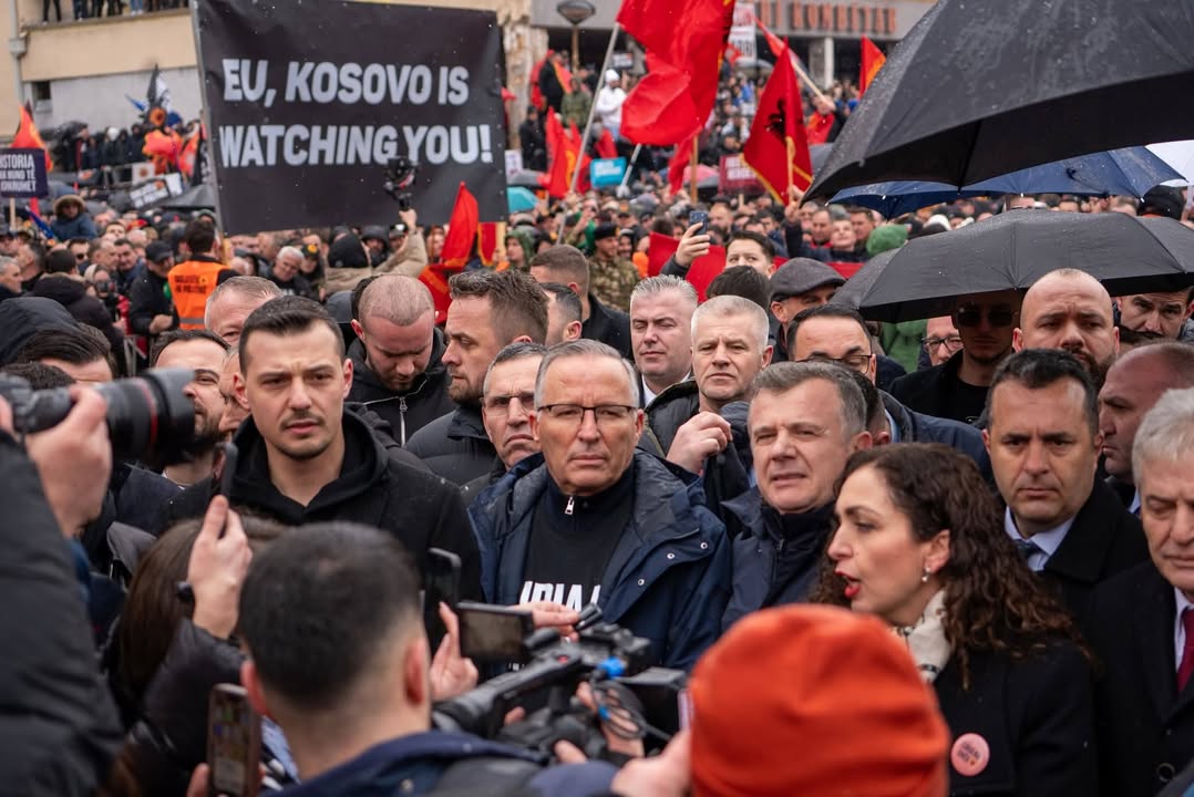 Djali i ish-presidentit Hashim Thaçi, Endriti ishte prezentë në marshin e sotëm ‘Drejtësi, jo politikë’. Afër tij po qëndronte kryetari i PDK-së, Bedri Hamza por edhe presidentja e vendit, Vjosa Osmani