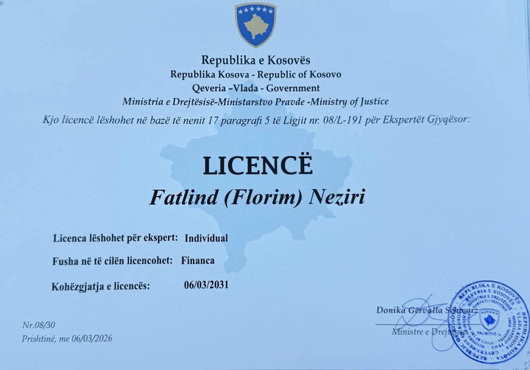 Dragashit i shtohet edhe një ekspert gjyqësor në fushën e financave Fatlind Neziri nga Dragashi ka dhënë sot betimin dhe ka marrë licencën si Ekspert Gjyqësor në fushën e financave, duke iu bashkuar kështu listës së ekspertëve që kontribuojnë në proceset gjyqësore në vend. Me këtë licencim, Dragashit i shtohet edhe një profesionist në këtë fushë të rëndësishme, i cili do të ofrojë ekspertizë me integritet, profesionalizëm dhe objektivitet në çështjet gjyqësore. — Dragash Info