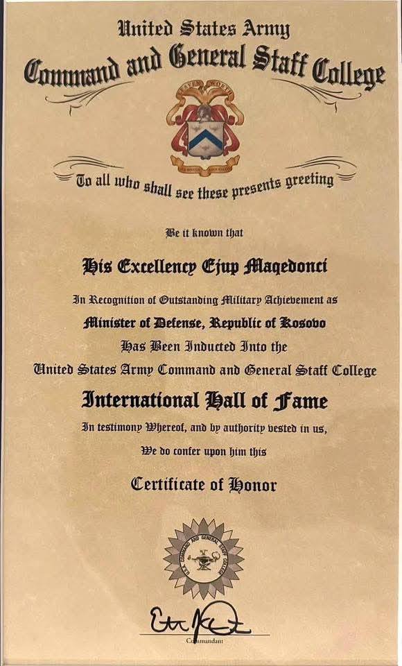 Republika e Kosovës ka marrë një tjetër nderim të rëndësishëm në arenën ndërkombëtare. Ministri në detyrë i Mbrojtjes, Ejup Maqedonci, është përfshirë zyrtarisht në Sallën e Famës (Hall of Fame) të Kolegjit të Komandës dhe Shtabit të Përgjithshëm të Ushtrisë së Shteteve të Bashkuara të Amerikës, në Fort Leavenworth.