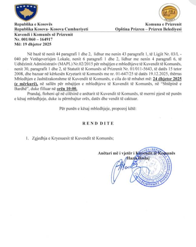 Kryetari Shaqir Totaj ka thirrur mbledhje të jashtëzakonshme të Kuvendit të Komunës, e cila do të mbahet më 24 dhjetor 2025 (e mërkurë), në “Shtëpinë e Bardhë” në orën 10:00, me ç’rast do të bëhet zgjedhja e Kryesuesit të Kuvendit të Komunës.