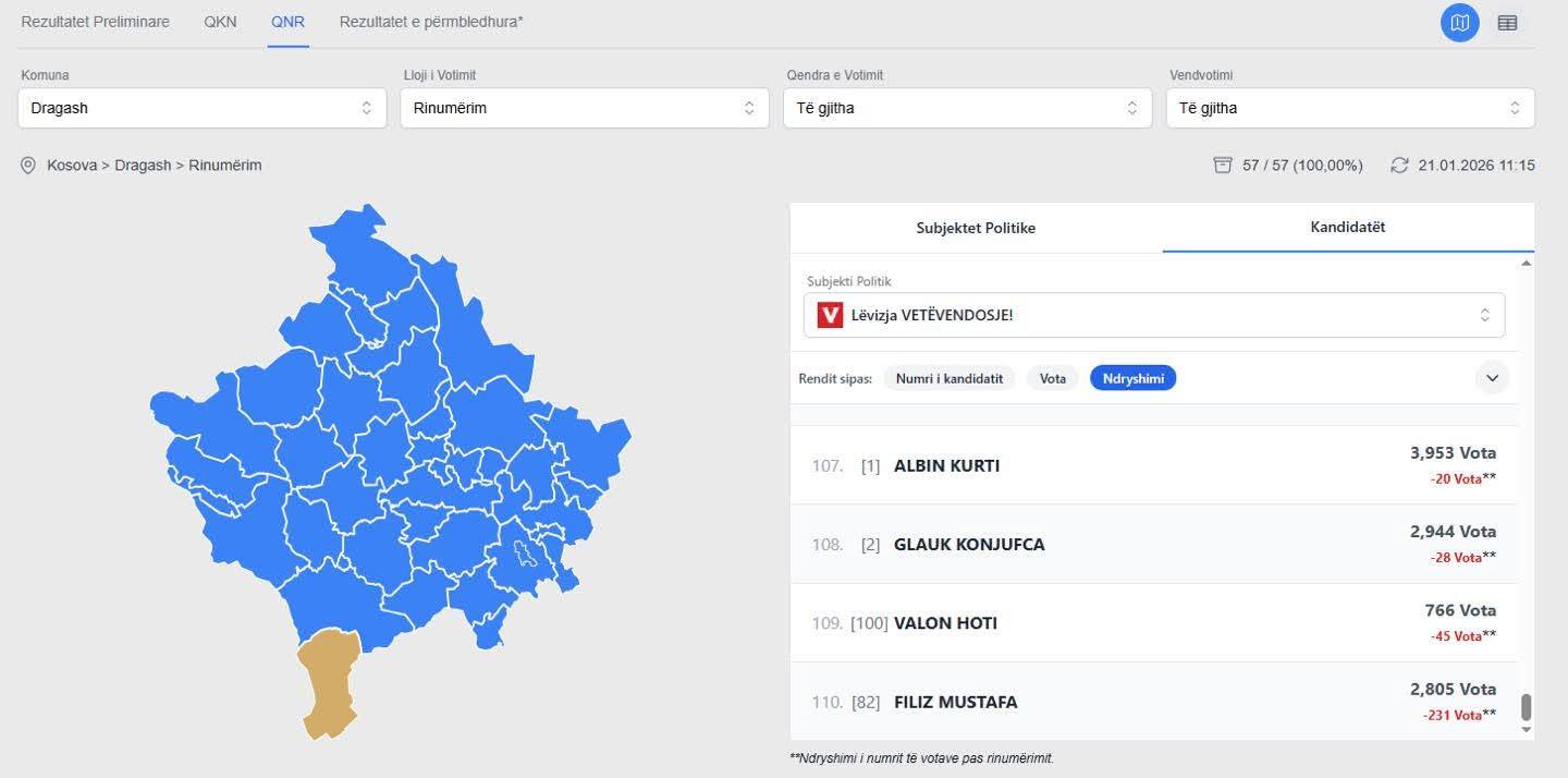 Megjithatë, sipas rezultateve të rinumërimit në Komunën e Dragashit, Filiz Mustafa mbetet kandidati me numrin më të madh të votave të hequra, duke u cilësuar si “kampion” i heqjes së votave në këtë proces.