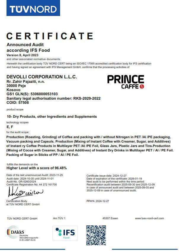 Brendi bën të ditur se të gjitha produktet e Prince Caffe prodhohen dhe operojnë në përputhje të plotë me certifikatat më të larta ndërkombëtare të cilësisë, sigurisë dhe standardeve ushqimore, duke përmbushur kriteret strikte të tregjeve evropiane dhe globale.