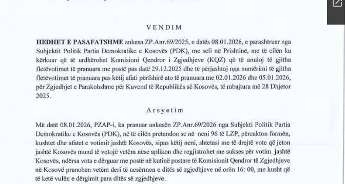 Paneli Zgjedhor për Ankesa dhe Parashtresa (PZAP) ka refuzuar si të pasafatshme ankesën e Partisë Demokratike të Kosovës (PDK), e cila kishte kërkuar që të mos numëroheshin fletëvotimet e diasporës të pranuara me postë pas datës 29 dhjetor 2025.
