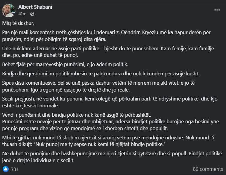 “Albert Shabani dhe të tjerë si ai kanë të drejtë t’i ruajnë bindjet dhe preferencat e tyre politike. Por një gjë duhet ta kemi të qartë: Kosova është mbi partitë”, ka theksuar Kryeziu, duke e cilësuar emigrimin e të rinjve si një nga dëmet më të mëdha për vendin.