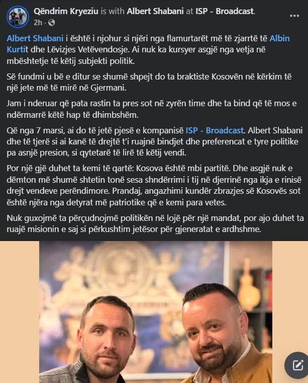 “Jam i nderuar që pata rastin ta pres sot në zyrën time dhe ta bind që të mos e ndërmarrë këtë hap të dhimbshëm. Që nga 7 marsi, ai do të jetë pjesë e kompanisë ISP – Broadcast”, ka shkruar Kryeziu.